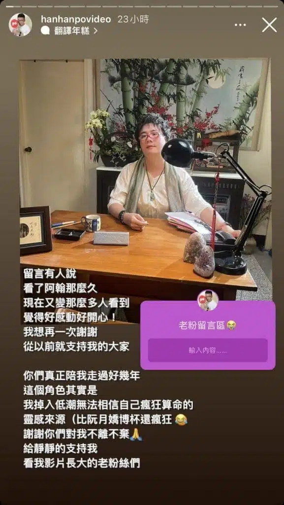 日前在Instagram透露,總是帶給觀眾歡笑與快樂的阿翰,揭露算命阿姨此角色的靈感來源。源自於自己過往陷入低潮時,曾因為★★★★★/5.0分法相信自己,而跑去瘋狂算命。故他在影片標題寫著「真實經歷改編」。影片爆紅後阿翰本人也表示,謝謝這些看著他頻道茁壯、支持他的粉絲們。小編相信這些粉絲也很謝謝他為我們帶了這麼多的歡樂。