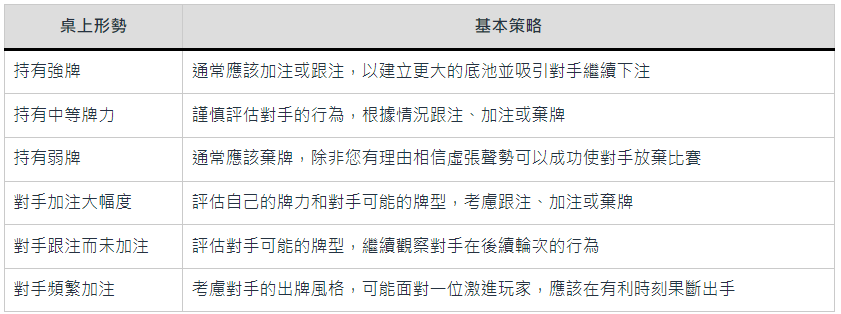 - 首輪下注:從大盲(或小盲)的左邊開始下注,玩家可以選擇跟注、加注或者棄牌。